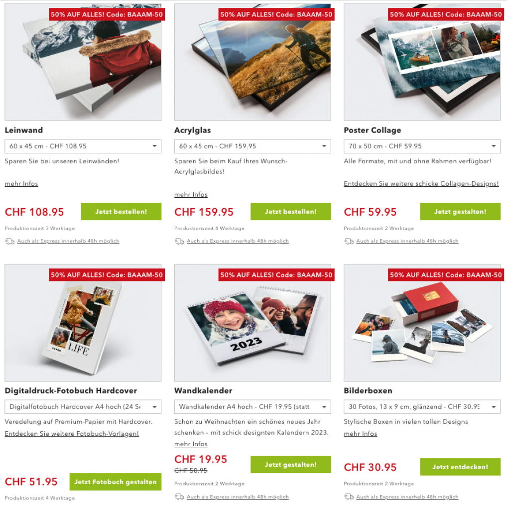 Ich habe es mal ausprobiert und mal erhält beispielsweise einen Fotokalender für CHF 7.50 anstatt CHF 14.95 oder Bilderboxen mit 30 Fotos im Polaroidstil ab CHF 15.50. Man kann auch Wandbilder, Fotobücher, Poster, Fotoabzüge mit 50% bestellen. Es kommen aber jeweils Versandkosten dazu. Diese betragen je nach Bestellung unterschiedlich ab CHF 7.95.