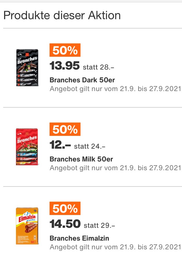 Die Aktion ist zwar vorbei, aber gestern habe ich hier in der Migros Wohlen AG im Restposten-Süssigkeitengestell noch ein halbes Dutzend Brancheskisten mit dem 50% Kleber gesehen.