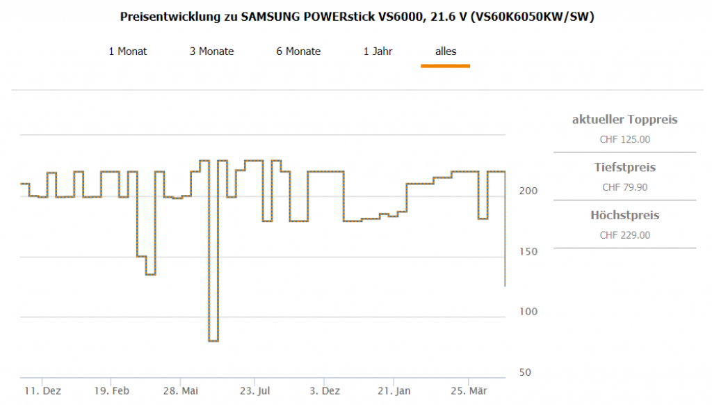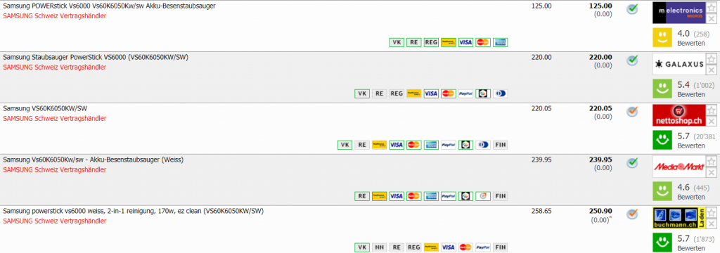 Bei melectronics gibt es den Staubsauger SAMSUNG POWERstick VS6000 für nur noch Fr.125.- inkl. den Fr. 10.- Rabatt für den Newsletter sind es dann nur noch Fr. 115.- anstatt dem zweitbesten Preis von Fr. 220.-!