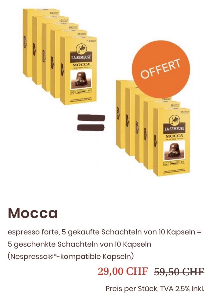 Beim Kauf von 50 Kapseln der Sorte Mocca gibt es weitere 50 Kapseln geatis dazu (Nespresso®-kompatible Kapseln), somit ein effektiver Preis von 29.- Rp. pro Kapsel.