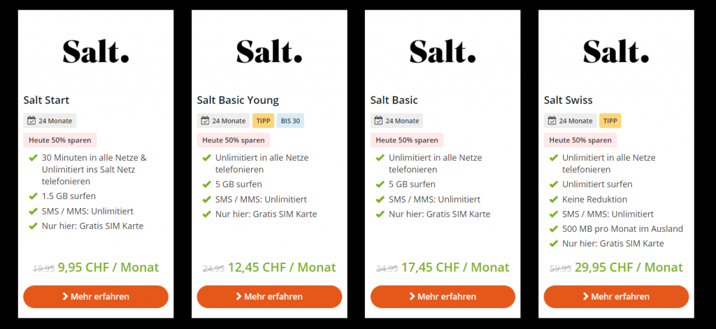 50% Rabatt auf alle Salt Handy Abos. Zudem schenken wir dir exklusiv die SIM Karte im Wert von CHF 59. Die Angebote starten bereits ab nur CHF 9.95 pro Monat.