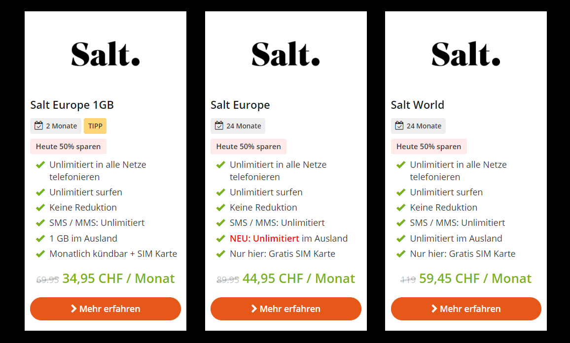 Salt Swiss und Salt Europe sind nicht so tolle Preise - aber die anderen Preise sind gut. Da besser zu Green (24.95Fr. = Smart Swiss)