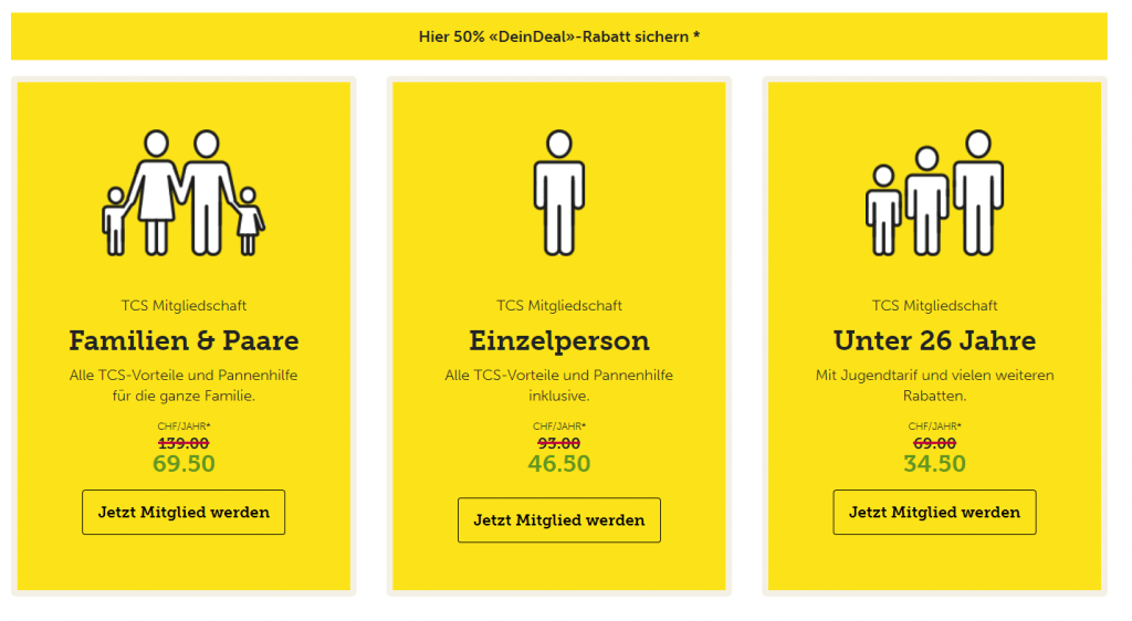 Bei DeinDeal gibt’s gerade ein coole Aktion, bei welcher alle Neumitglieder fürs erste Jahr 50% auf ihre TCS Mitgliedschaft erhalten. Nebst gratis Pannenhilfe gibt’s beispielsweise auch einen grosszügigen Rabatt auf Trainings- und Fahrkurse vom TCS, gratis Rechtsberatung und vieles mehr.