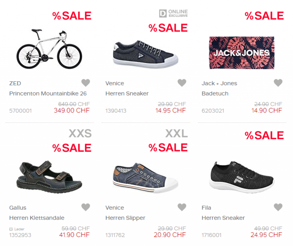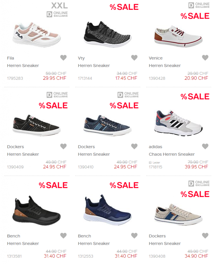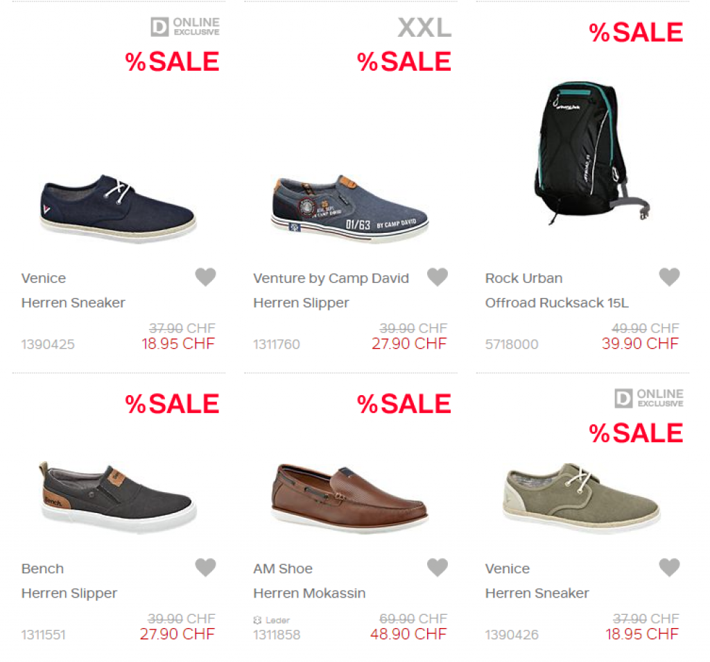 Auch bei Dosenbach gehen die Reduzierungen weiter. Im Sale gibt’s derzeit über 900 Artikel zum halben Preis. Da auch die Lieferung unabhängig vom Bestellwert gratis ist, findet man hier einige günstige Schuhe und sonstige Artikel.