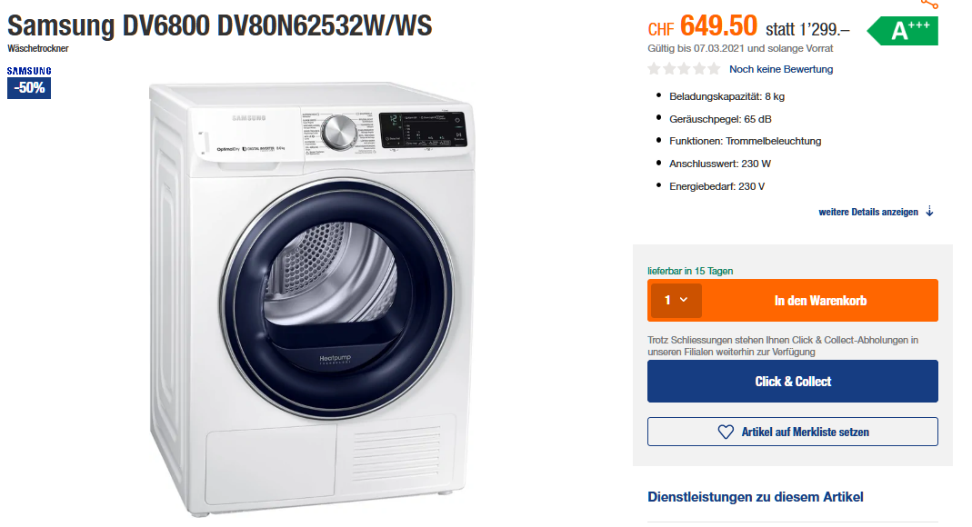 ERGÄNZUNG, 22.02.2021, 15.50 Uhr: Der Trockner ist leider bereits ausverkauft und momentan nicht lieferbar. Auch in den Filialen ist zur Zeit kein Modell zur Abholung bereit.