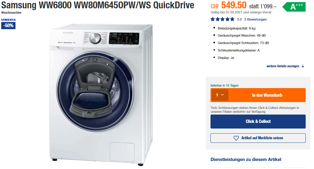Bei melectronics gibt es gerade eine Waschmaschine und einen Trockner mit je 50 % Rabatt, was gemäss toppreise als Bestpreis gilt. Wichtig ist dabei, es ist keine Waschturmkombination, sondern werden als Einzelgeräte verkauft.