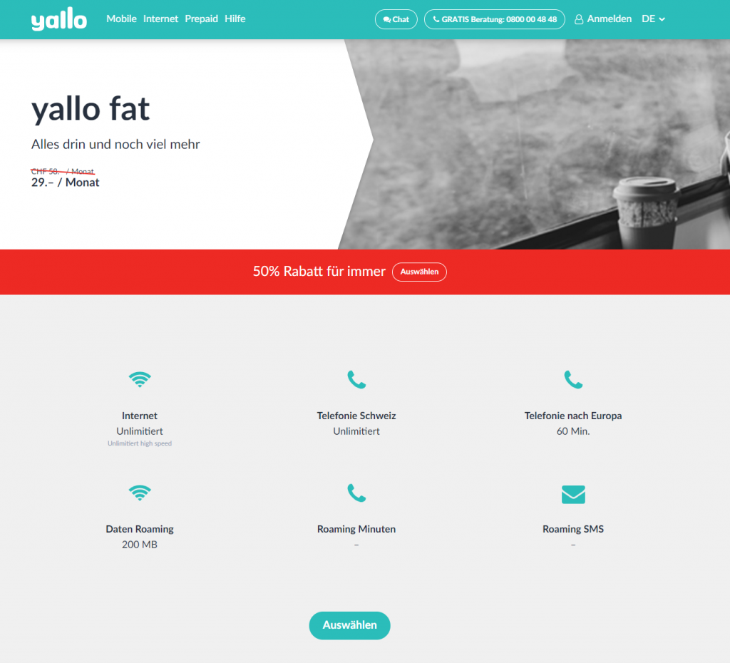 50% auf Yallo Fat: CH alles unlimitiert + 200 MB Roaming + 60 Min. nach Europa