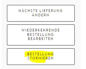 Sobald die erste Bestellung angekommen ist kann die wiederkehrende Bestellung unter „Mein Konto“ / „Wiederkehrende Bestellungen“ wieder storniert werden.