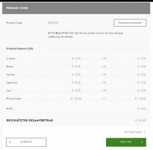 Auf der Nespresso Seite auf „Abo“ / „Kaffee Abo“ und ein neues Abo mit den gewünschten Kapseln erstellen (min. 50 und Idealerweise genau 50) und den Promo Code „easy21“ eingeben. Hier ein Beispiel Warenkorb: