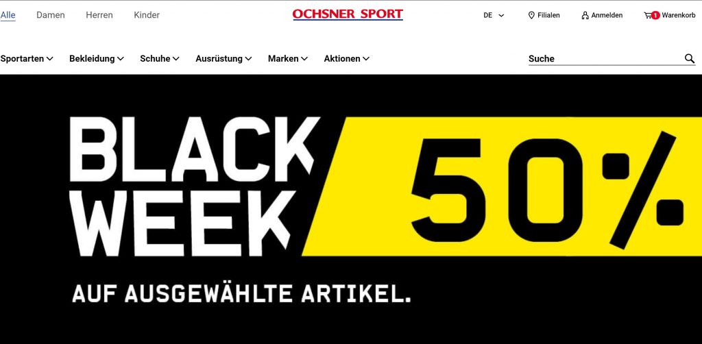 Bei Ochsner Sport gibt es gerade 50% Rabatt auf ausgewählte Artikel in der Black Week. Es sind viele Artikel in der Kategorie Fitness reduziert und einige wenige in der Kategorie Wintersport.