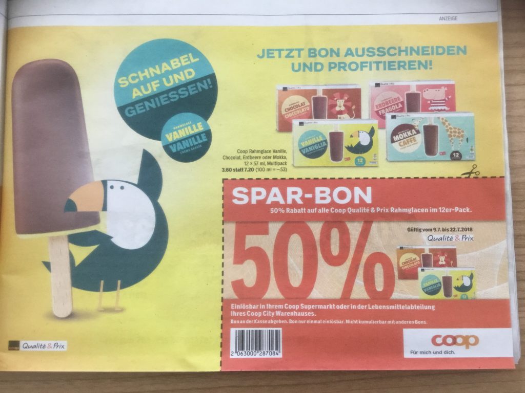 Gerade richtig für die kommenden schönen Tage gibt’s bei Coop wieder 50% Rabatt auf alle Coop Qualité & Prix Rahmglacen im 12er Pack. Es gibt die Rahmglace in den Sorten Chocolat, Mokka Caffe, Erdbeer und Vanille. Damit du profitieren kannst, musst du entweder den Bon in der Coop-Zeitung ausschneiden (Seite 33, liegt auch direkt im Coop auf) oder den Bon in der Supercard-App suchen und aktivieren. Die Aktion gilt noch bis am 22. Juli.