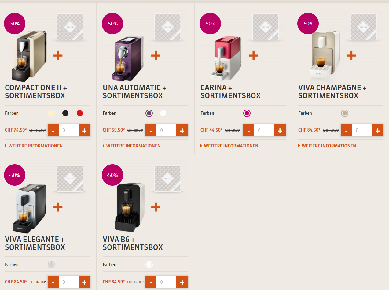Beispielsweise die Delizio Viva B6 für CHF 84.50 statt CHF 161.- (vgl. Toppreise).