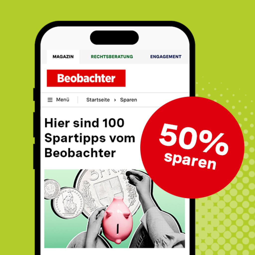 Bis zum 31. Januar 2026 kannst du das Jahresabo Beobachter Digital mit 50 % Rabatt zum Vorteilspreis erhalten: 1 Jahr Digital für CHF 65.– statt CHF 130.–.