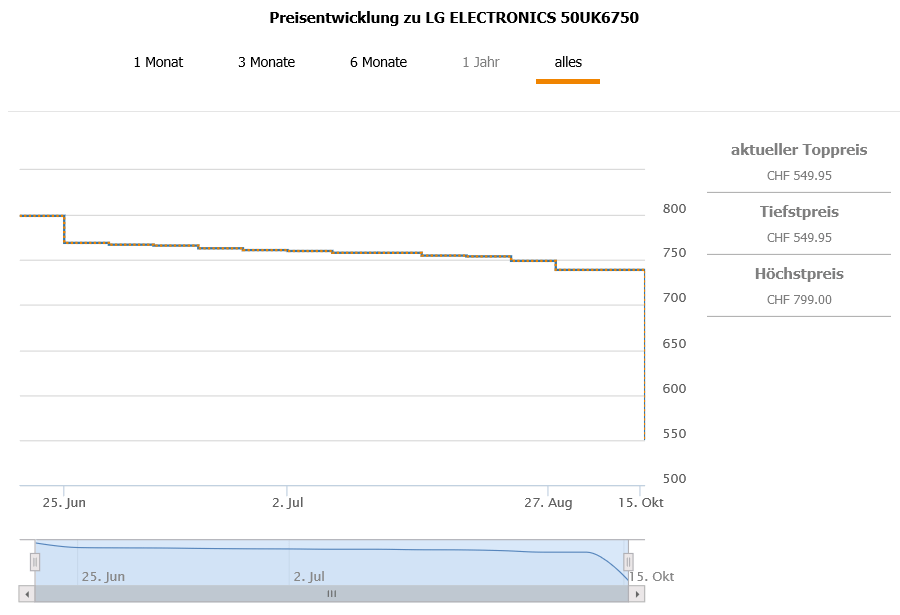 Gemäss toppreise gab es den TV bislang nie günstiger als für 739.- CHF was zugleich aktuell auch der zweitbeste Preis ist.
