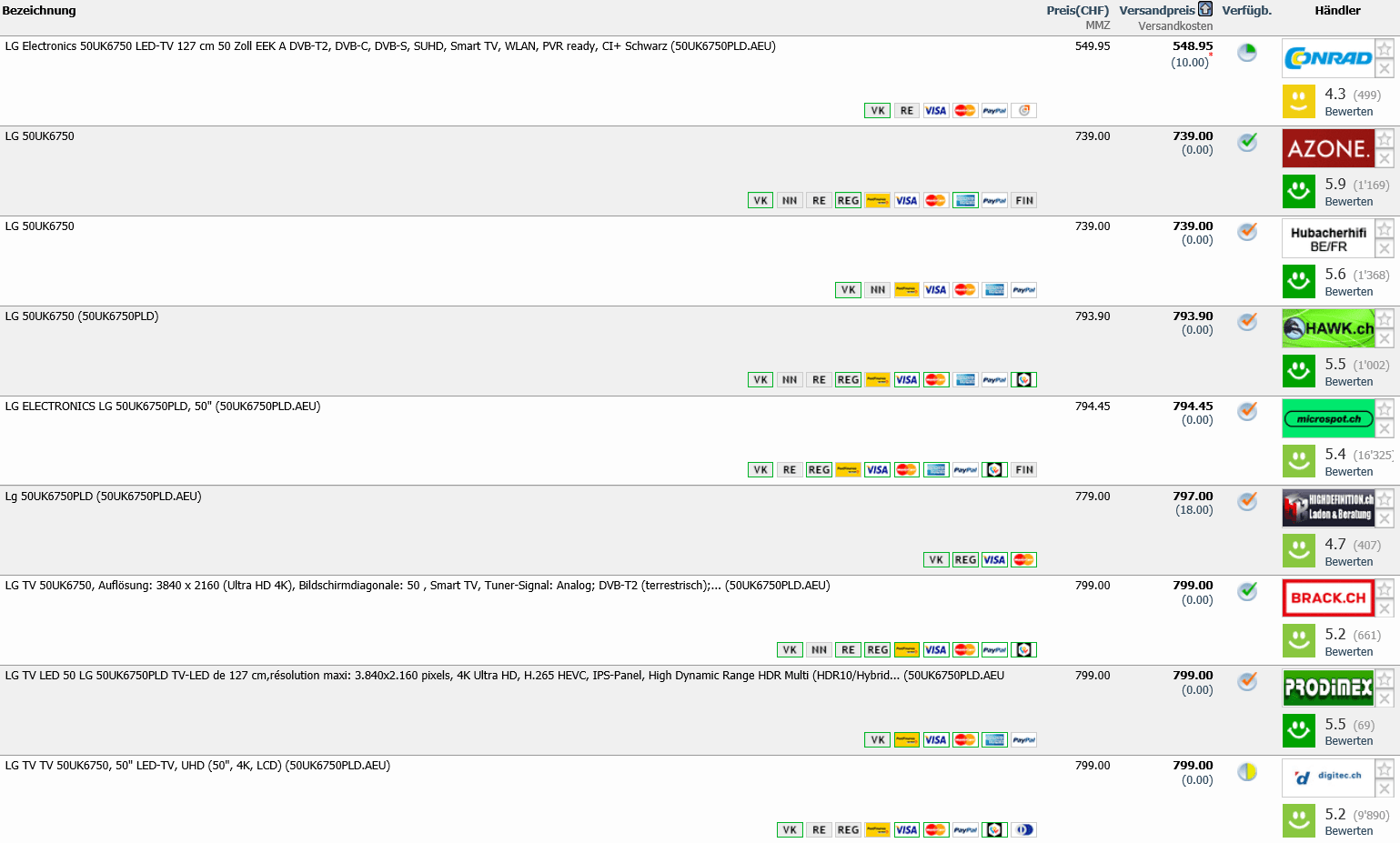 Bei conrad gibt es gerade den 50″ TV LG ELECTRONICS 50UK6750 für 549.95 CHF (+10.- CHF Versandkosten).