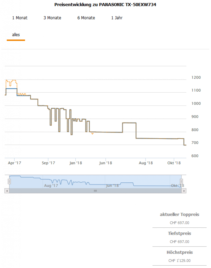 Mit allen Tricks hatten wir den TV bereits mal für 709.10 CHF, regulär gab es ihn bislang nie günstiger als für 745.45 CHF, der zweitbeste Preis sind aktuell 746.95 CHF.