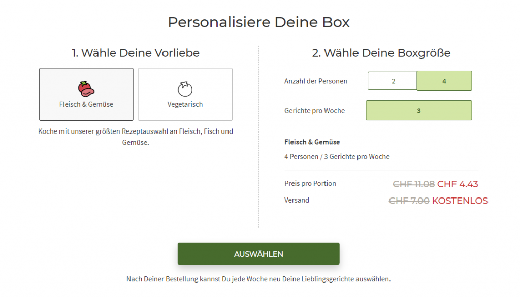 Der grösste Kritikpunkt für mich: Preis-Leistung stimmt nicht, es ist einfach zu teuer. Einkaufen gehen muss ich sowieso, und bei Migros/Coop bekomme ich die Zutaten zum halben Preis.
