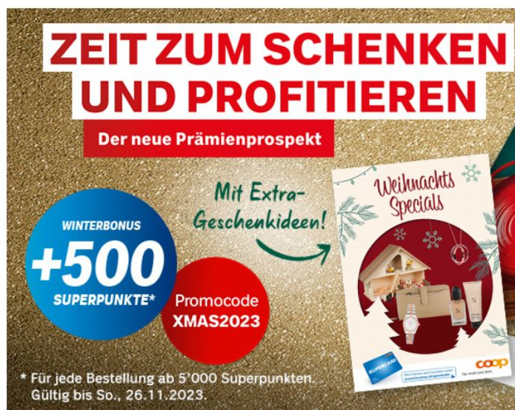 Bis zum 26. November 2023 erhält jede Prämienbestellung zusätzlich 500 Superpunkte*. Einfach den Code XMAS2023 eingeben.