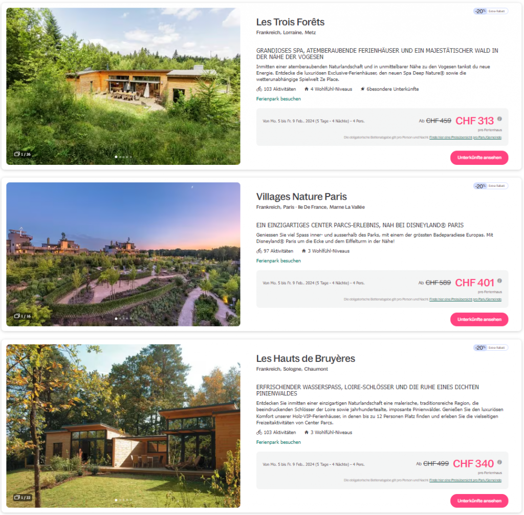 Center Parcs betreibt Ferienhäuser in Deutschland, Frankreich Belgien und Niederlande. Die Unterkünfte bieten in der Regel Platz für 2 – 20 Personen und sind in drei Ausstattungsvarianten unterteilt. Aktuell gibt es 27 Parks.
