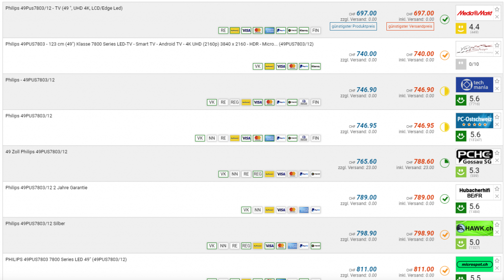 Bei Fust erhält man gerade den 55“ 4K TV Philips 55PUS7803 für den neuen Bestpreis von CHF 599.- Mit Gutscheincode 1119RM gibt’s nochmals 20.- Rabatt, dann also für CHF 579.- Der zweitbeste Preis liegt derzeit bei CHF 697.- Bestpreis war laut toppreise bei CHF 689.-