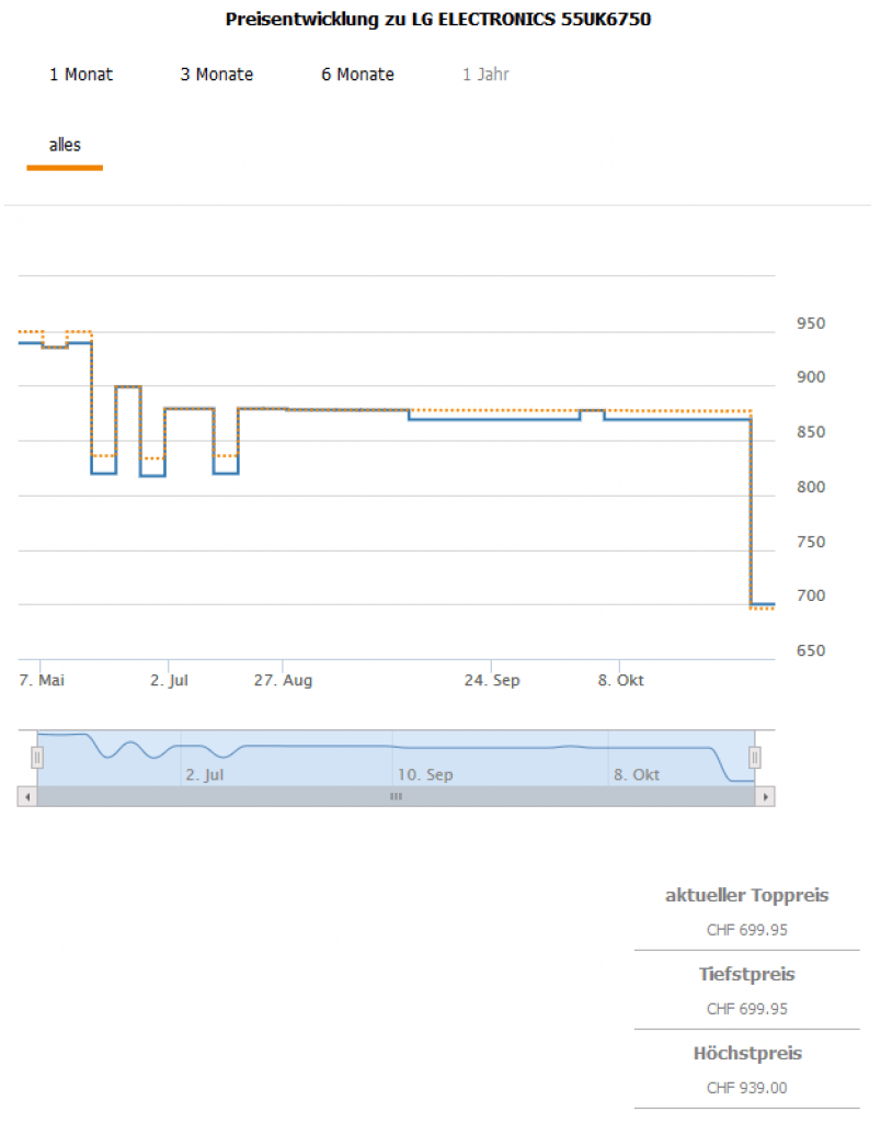 Gemäss toppreise gab es den TV bislang nie günstiger als für 833.52 CHF, der zweitbeste Preis liegt aktuell bei 876.75 CHF.