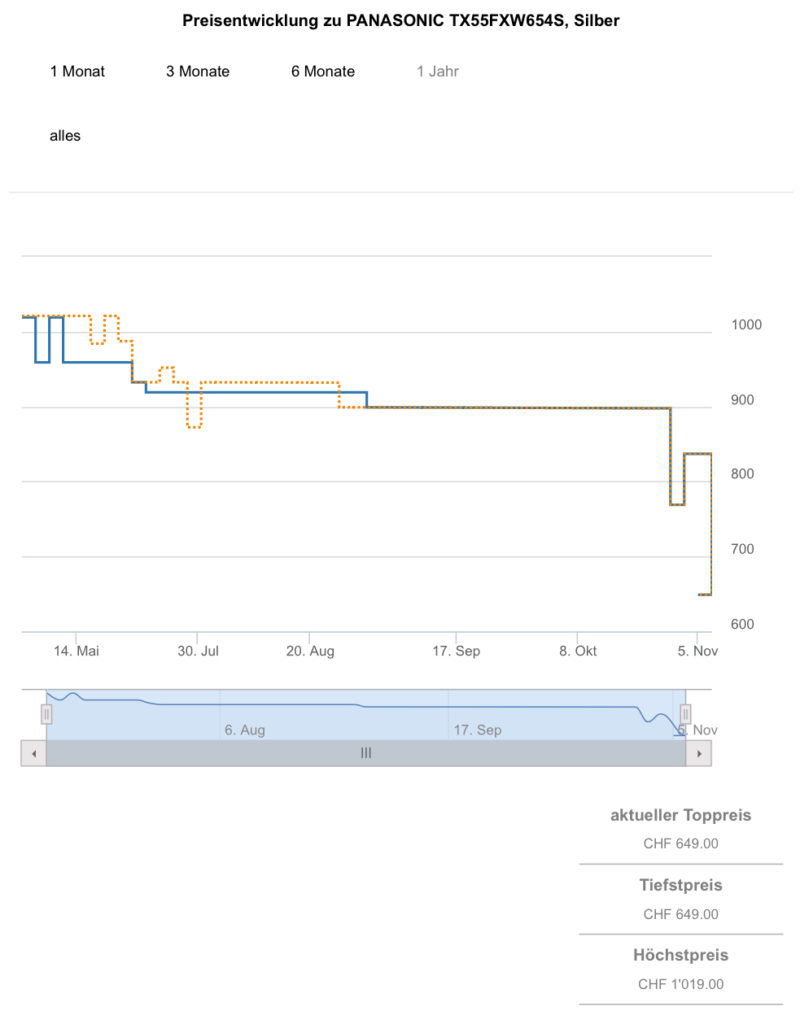 Gemäss toppreise war der best price bislang bei 769.- CHF, der zweitbeste Preis liegt aktuell bei 789.15 CHF.