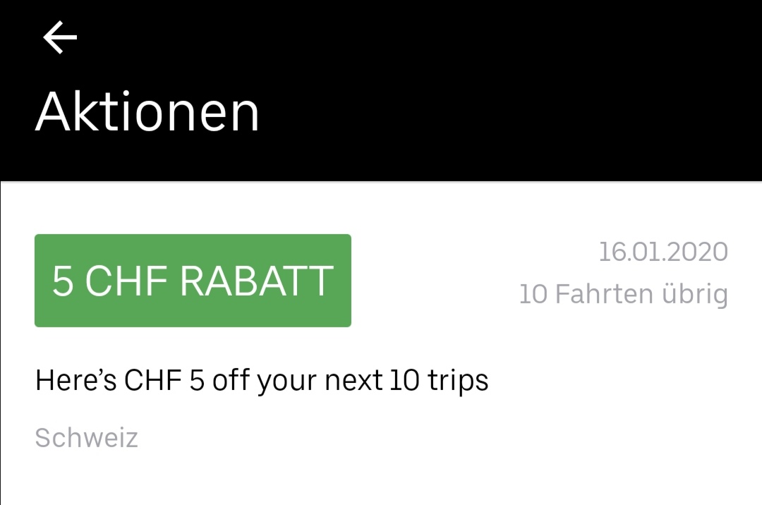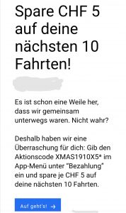 Die Feiertage stehen an und man ist öfters zu Essen eingeladen wo man ja auch das ein oder andere Gläschen trinkt. Damit man auch sicher nachhause kommt, gibts von Uber ein Gutscheincode womit man auf ganze 10 Fahrten je ein Rabatt von 5CHF erhält. Einfach bei der Uber App im Menu bei Bezahlungen den Code „XMAS1910X5“ eingeben. Die Gutscheine sind nur bis zum 16 Januar Gültig. Allr aufzubrauchen wird einbischen Schwer, aber auch nur bei einer Fahrt lohnt es sich.