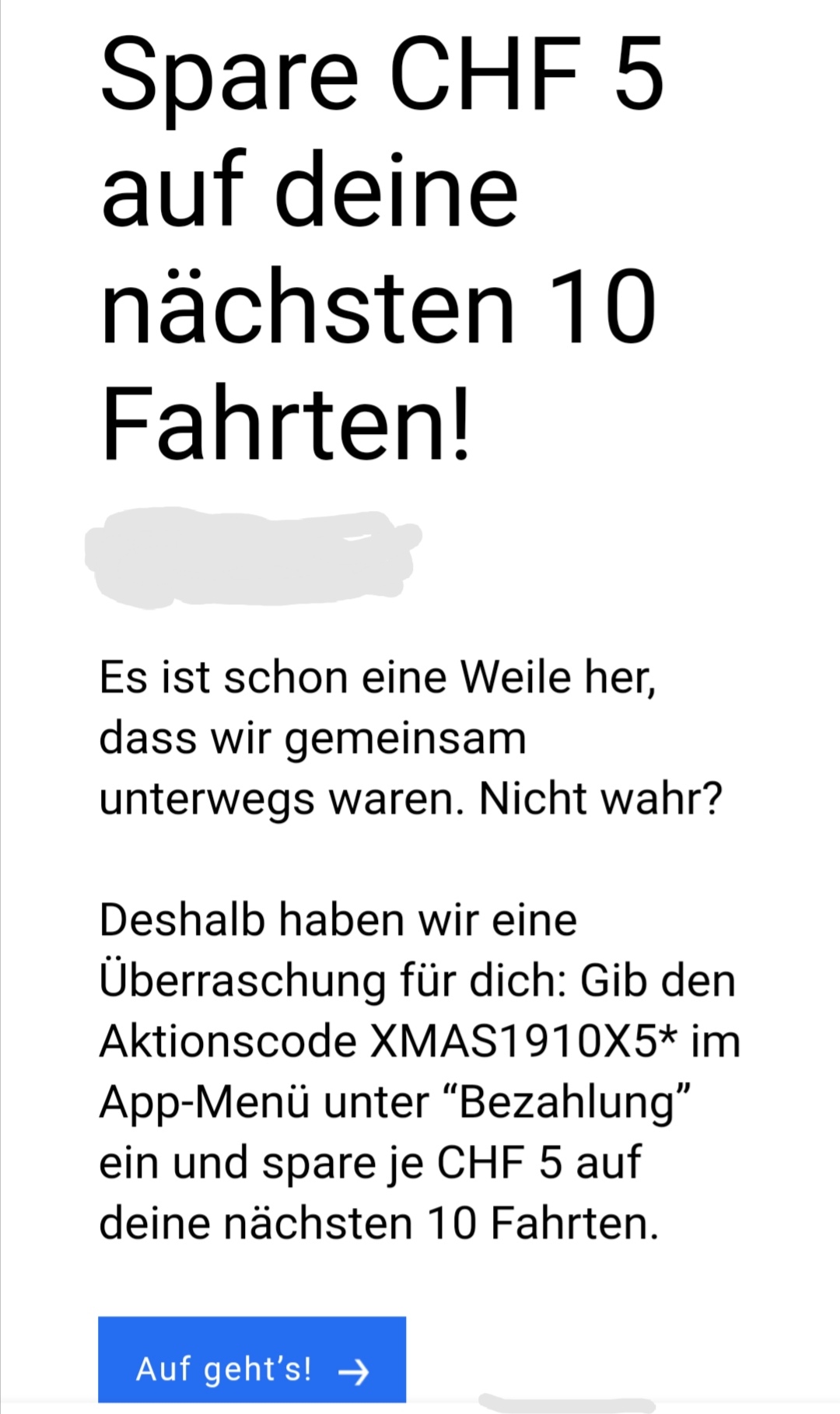 Ich habe das gleiche Mail bekommen doch bei mir sinds 10 Fr. Versuchts mal mit "XMAS1910X10"