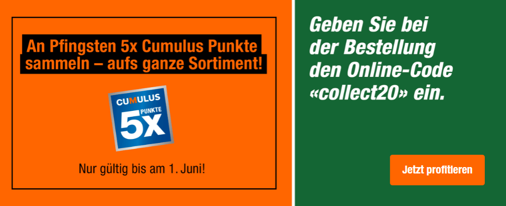 Heute gibts 5fache Cumulus-Punkte bei Migros Do It + Garden. Um in Genuss der Punkte kommen zu können, müsst ihr im Bestellprozess (analog melectronics) den Gutscheincode collect20 angeben. Vergesst nicht, dass ihr ab einem Mindestbestellwert von 50 Franken auch noch den Newsletter-Gutschein im Wert von 10 Franken einsetzen könnt.
