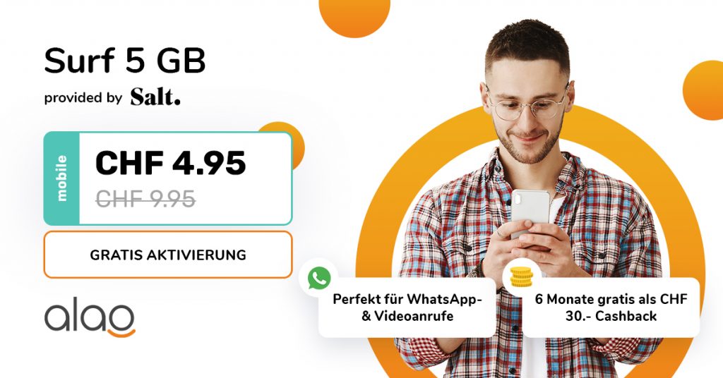 Bei alao gibts derzeit ein Hammerangebot. So kriegt ihr die Daten-SIM Surf 5GB von Salt zum Preis von unter 2 Franken! Um den Dealpreis zu erreichen müsst ihr den Gutscheincode, den ihr aus der Teilnahme am Gewinnspiel erhaltet (es dauert ca. einen Tag, bis der Gutscheincode per E-Mail ankommt), angeben. 6 weitere Monate sind in Form von 30 Franken Cashback geschenkt, macht also bei 24 Monaten 118.80 Franken - 75 Franken Cashback = CHF 43.80 oder CHF 1.875 / Monat.