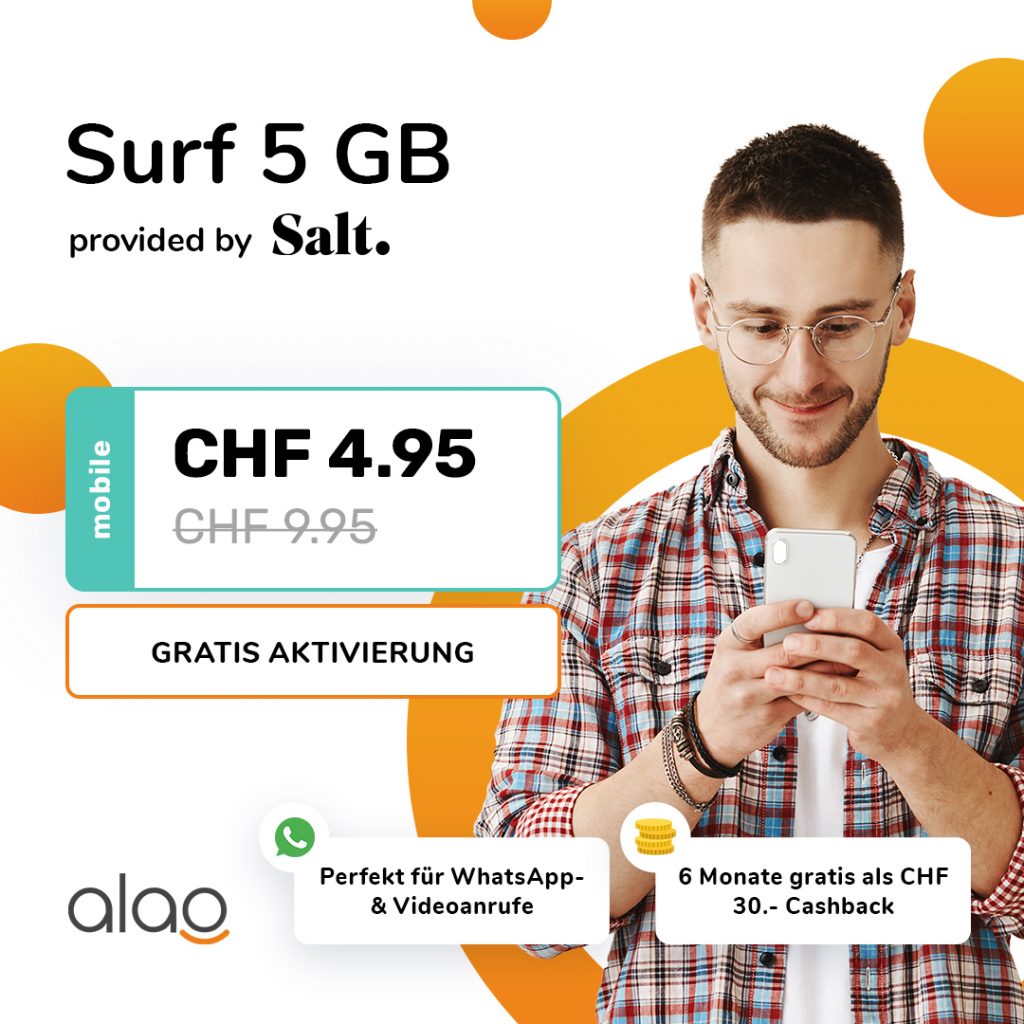 Bei alao gibts derzeit ein Hammerangebot. So kriegt ihr die Daten-SIM Surf 5GB von Salt zum Preis von unter 2 Franken! Um den Dealpreis zu erreichen müsst ihr den Gutscheincode, den ihr aus der Teilnahme am Gewinnspiel erhaltet (es dauert ca. einen Tag, bis der Gutscheincode per E-Mail ankommt), angeben. 6 weitere Monate sind in Form von 30 Franken Cashback geschenkt, macht also bei 24 Monaten 118.80 Franken - 75 Franken Cashback = CHF 43.80 oder CHF 1.875 / Monat.