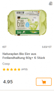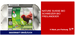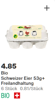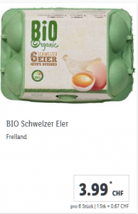 Bei ALDI und LIDL kriegt man ab morgen eine 6-er-Schachtel CH-Bio-Eier aus Freilandhaltung zum Aktionspreis von CHF 3.99. Im Migros kosten diese CHF 4.85 und im COOP CHF 4.95.