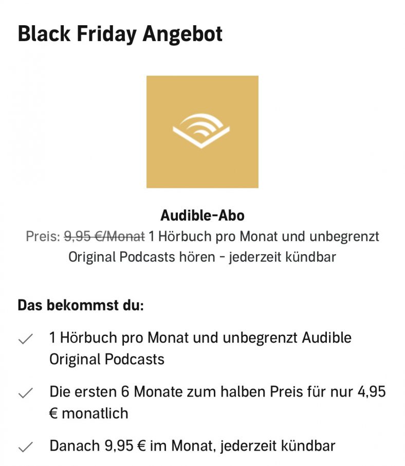 Audible hat bereits den Black Friday eingeläutet und bietet das monatliche Abo für 6 Monate zum Preis von 4.95 € anstatt 9.95 € an. Dafür erhält man jeden Monat 1 Guthaben für ein Hörbuch.