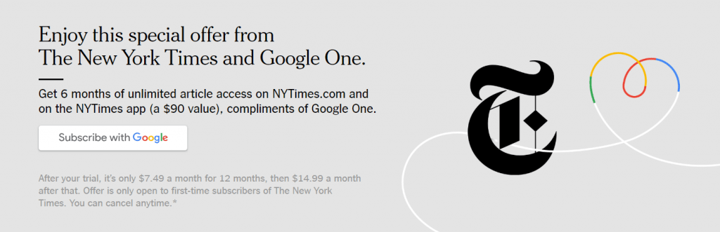 Via Google kann man sich gerade ein Digitalabo der New York Times für 6 Monate lang gratis sichern. Unbedingt direkt nach der Bestellung das Abo wieder kündigen - den Zugriff auf die digitale Zeitung bleibt in den sechs Gratis-Monaten trotzdem bestehen.