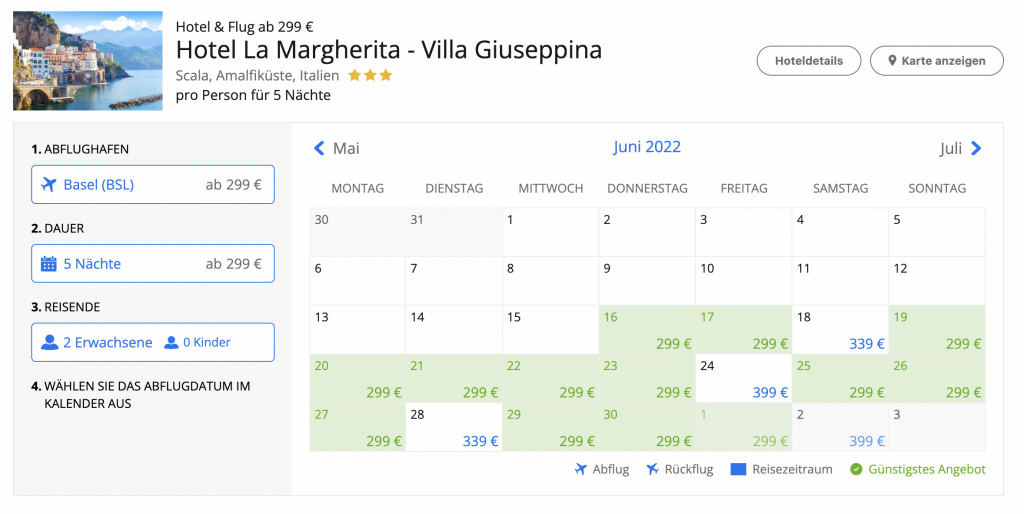 Bei Travelzoo gibt es derzeit ein Angebot, welches bis zum 30. Mai gebucht werden kann. Für 598 € (ca. CHF 614) fliegt man von Basel nach Neapel und übernachtet 5 Nächte im 3-Sterne Hotel La Margherita - Villa Giuseppina.