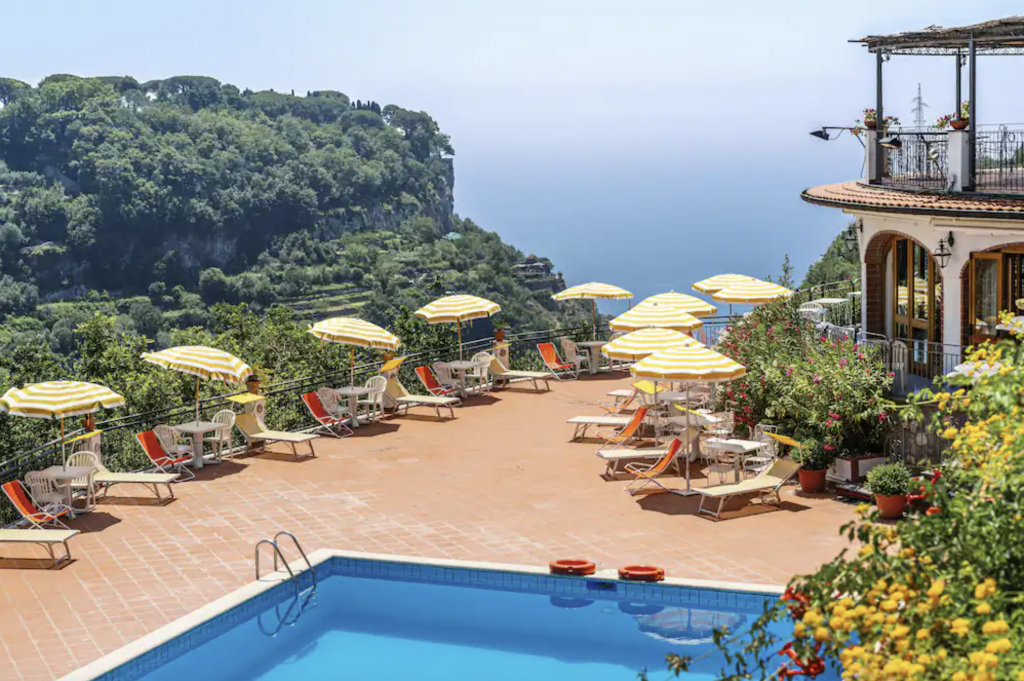 Die Hotelanlage befindet sich hoch oben auf einem Berg, umringt von Pinien, Palmen und Zypressen. Beim Blick von der Sonnenterrasse mit Pool gerät man schnell ins Schwärmen – und versteht, warum schon Johann Wolfgang von Goethe so hingerissen war von dieser Gegend.