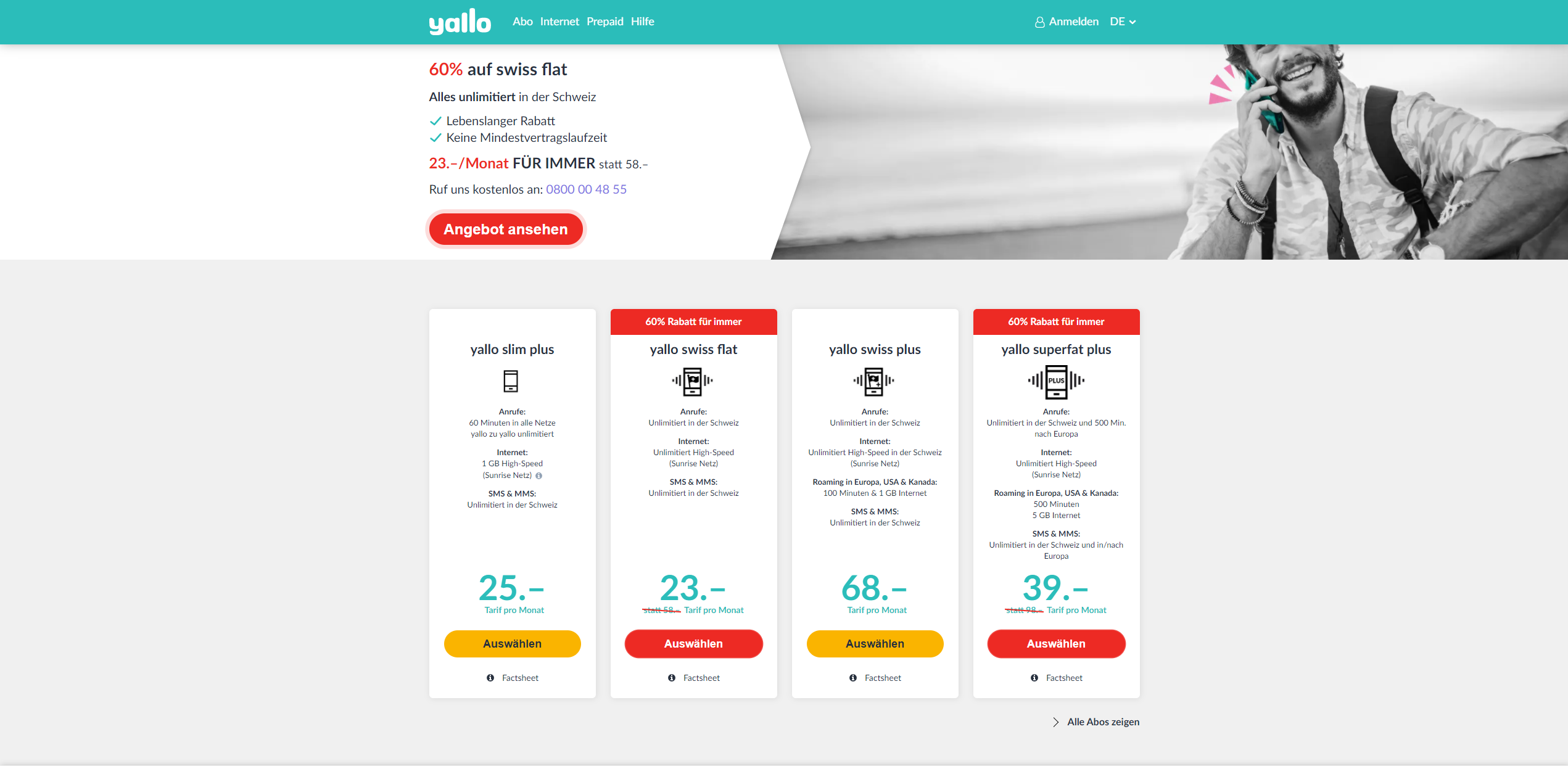 Bei Yallo gibt es wieder einmal eine Aktion (bis am 21. September) auf das swiss flat und superfat plus ohne Mindestvertragslaufzeit und mit lebenslangem Rabatt . Ich benutze selber seit letztem Black Friday das Yallo Abo und bin sehr zufrieden, das Netz ist stark (läuft über das Sunrise Netz) und somit ein hammer Preis-Leistungsverhältnis.