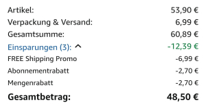 So kommt ein Endpreis von 48.50€ raus, was ~ 44.60 CHF entspricht, womit wir nun am Ende unserer Reise bei unter 75 Rappen pro Stück angelangt sind. Wenn man das nun mit dem ~3.50 Einzelpreis im Grossverteiler bei uns vergleicht, ist das schon absolut gewaltig und entspricht etwa 79% Rabatt.
