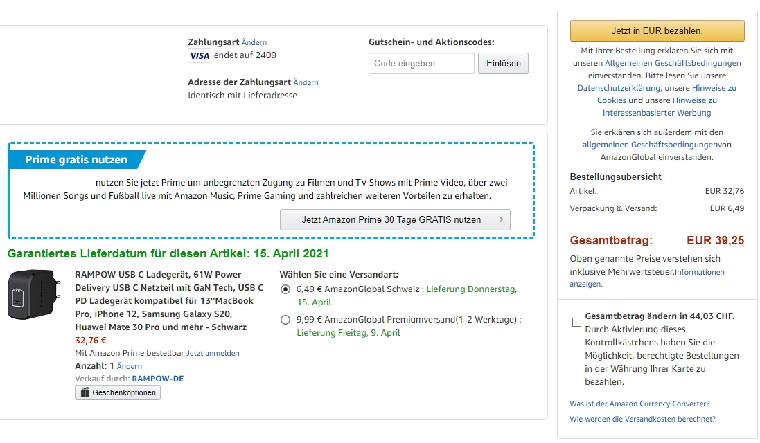 Bei Amazon gibts derzeit das USB-C-Ladegerät von RAMPOW mit 61W Ladeleistung und Power Delivery 3.0 Protokoll zum Aktionspreis von knapp 22 Franken. Einen Vergleichspreis zu finden ist eher schwierig, der einzige Schweizer Shop der es auch anbietet verlangt horrende CHF 100.50, ein anderes Noname-Ladegerät kostet bei Apfelkiste CHF 44.90.
