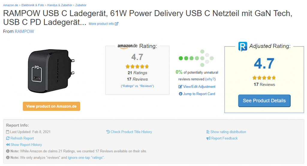 Zumindest laut Reviewmeta sollen es zudem durchwegs echte, positive Amazon-Bewertungen sein.