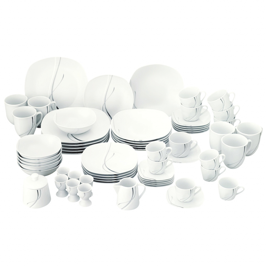 Weisses Porzellan abgestimmt mit feinen, grauen Linien. Das 62-teilige Kombiservice SILVER NIGHT besteht aus 6 Bechern, 6 Kaffetassen mit Untertassen, 6 Espressotassen mit Untertassen, 6 Eierbechern, 6 Schüsseln, 6 Desserttellern, 6 Suppentellern, 6 Speisetellern, 1 Milchkännchen und 1 Zuckerdose mit Deckel.