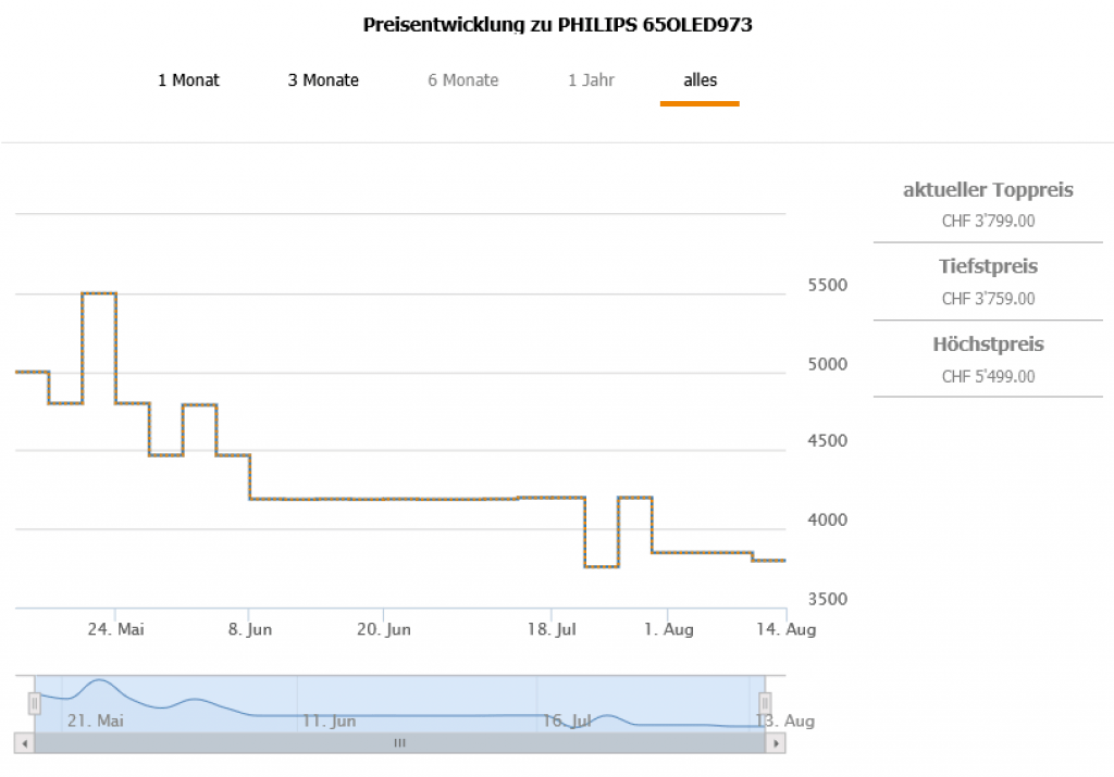 Gemäss toppreise gab es den TV bislang nie günstiger als für 3759.- CHF, der zweitbeste Preis liegt aktuell bei 3799.- CHF.