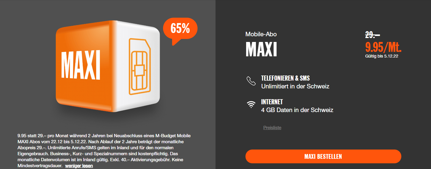 65% Rabatt auf M-Budget Mobile Maxi (CH Telefonie + SMS unlimitiert, 4GB Internet-Daten, Swisscom-Netz) für CHF 9.95 / Mt.