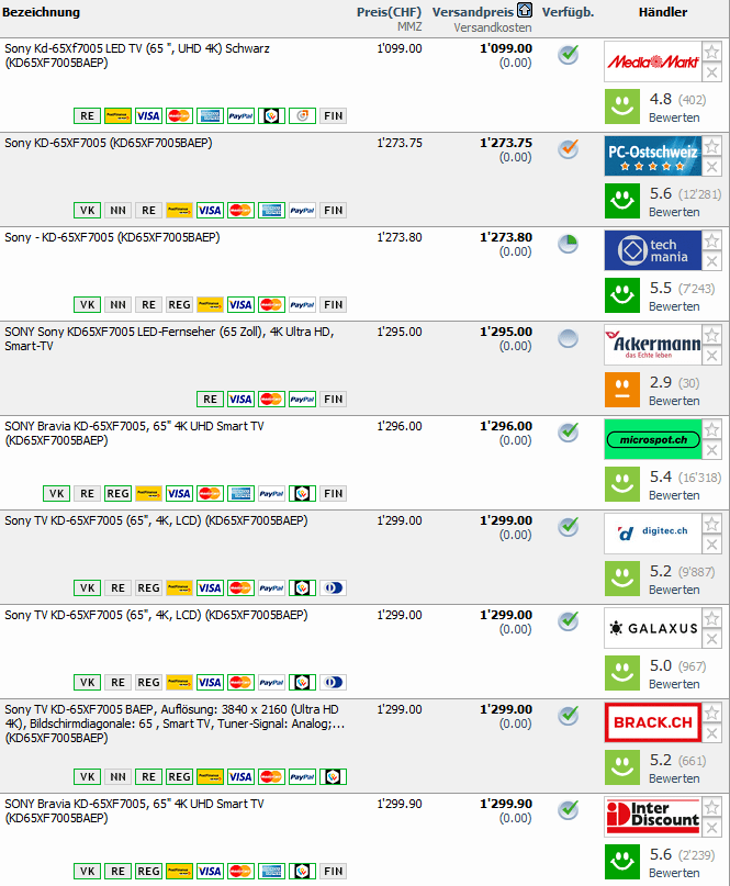 Gemäss toppreise gab es den TV bislang nie günstiger als für 1189.15 CHF, der zweitbeste Preis liegt aktuell bei 1273.75 CHF.