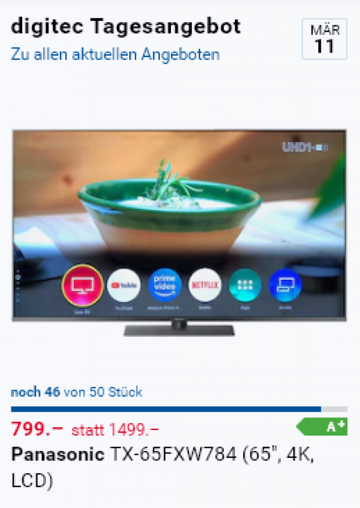 Bei digitec gibt es nun den TX-65FXW784 für 799.- im Angebot.