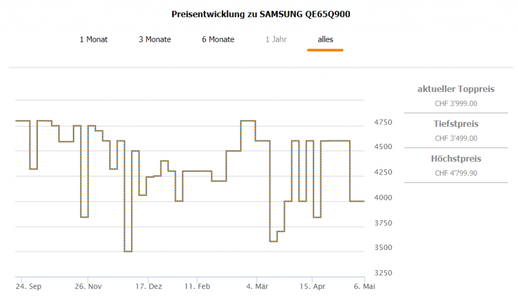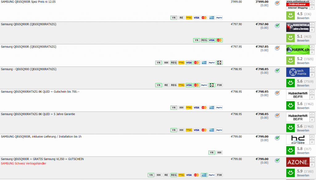 Bei DayDeal gibt’s als Deal of the Week den 65-Zoll-QLED-8K-TV Samsung QE65 Q900 für CHF 2999.- Bestpreis laut toppreise war bei CHF 3499.- Zweitbester Preis ist bei CHF 3999.-