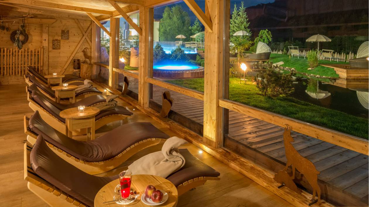 • Nutzung der 2.000 m² Wellnessoase: Almsauna mit 8 Schwitzkabinen, Tauchbecken, Ruheräume, Dress-on-Familiensauna mit 3 Schwitzkabinen und Whirlpool, Wellnesstees und Südtiroler Äpfel, Schwimmbad mit Massagedüsen und Schleuse ins Außenbecken, Hot-Whirlpool und XXL-Infinity-Whirlpool im Freien