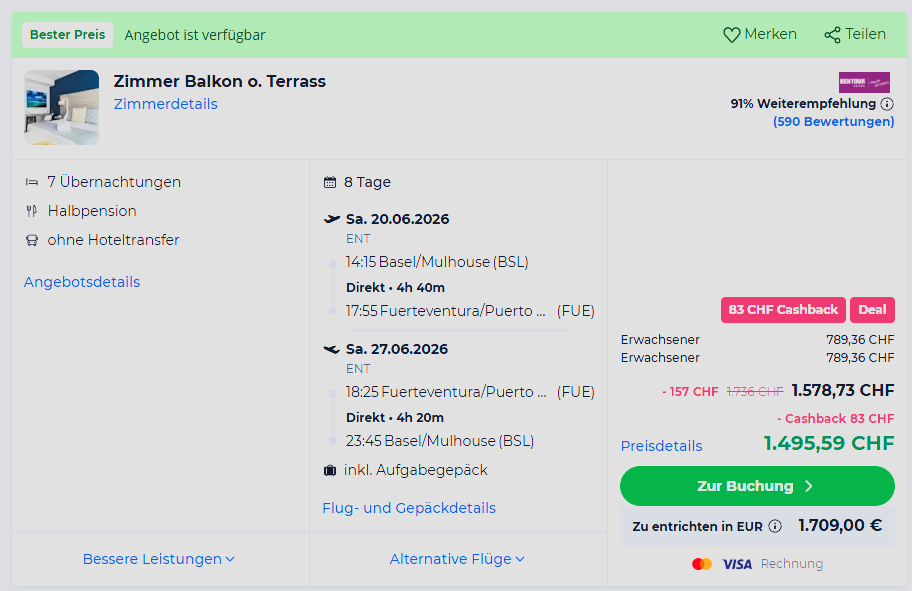 Beim Vergleich mit anderen Plattformen habe ich für den Beispielzeitraum einen Vergleichspreis von 1827 Franken festgestellt. Beachtet allerdings, dass hier noch der Transfer preislich ontopkommt. Immerhin habt ihr aber so die flexible Wahl zwischen einem Mietwagen (wenn ihr die Insel erkunden möchtet) oder einem eigens organisierten Transport vom und zum Flughafen.