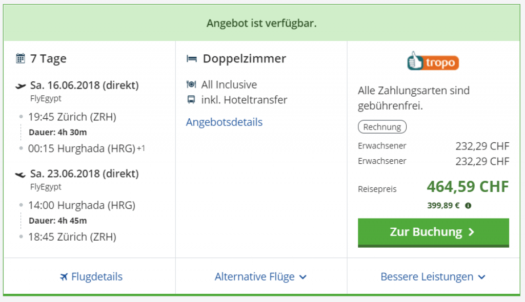Ich habe gerade ein tolles Angebot gefunden: 7 Tage All Inclusive in einem gut bewerteten 4* Hotel in Hurghada für CHF 232.30 pro Person inkl. Flug ab Zürich.
