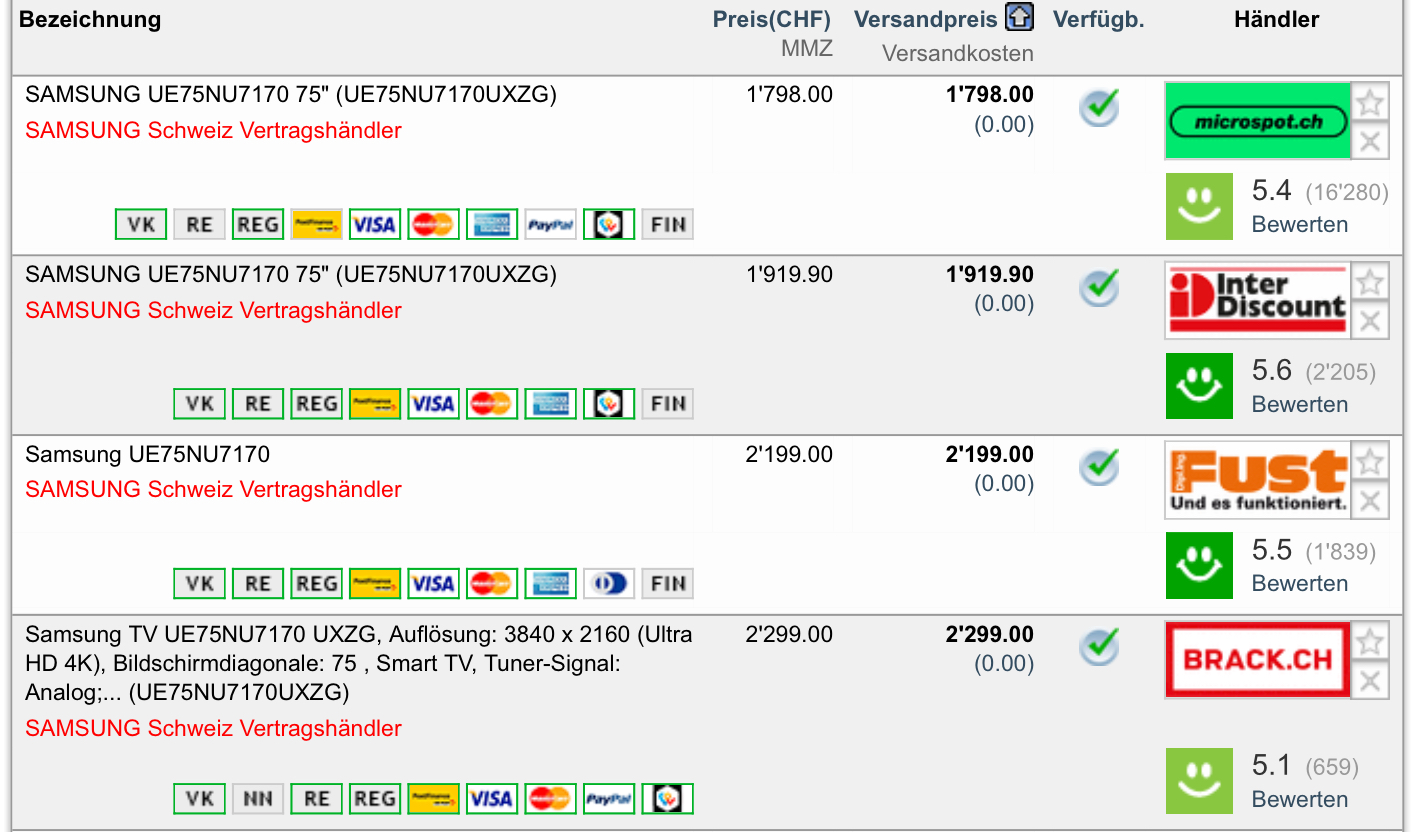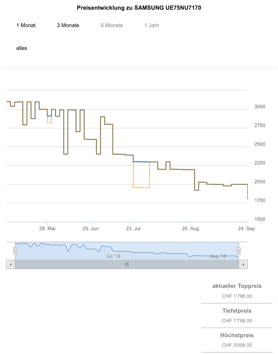 Gemäss toppreise gab es den TV bislang nie günstiger als für 1919.90 CHF, was aktuell auch der zweitbeste Preis ist.